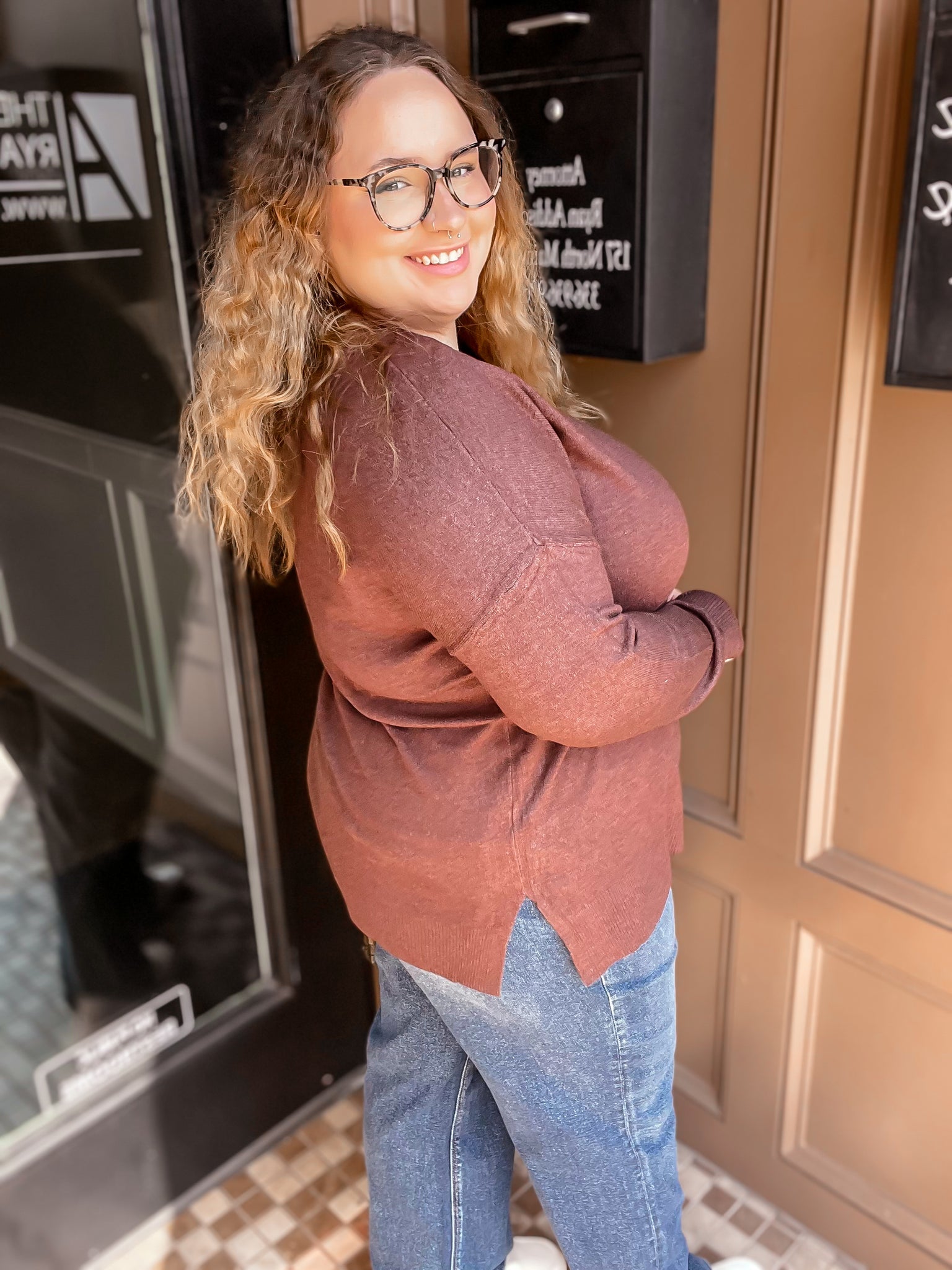 Our Gina sweater is the softest material with a front seam detail and a roomy fit!